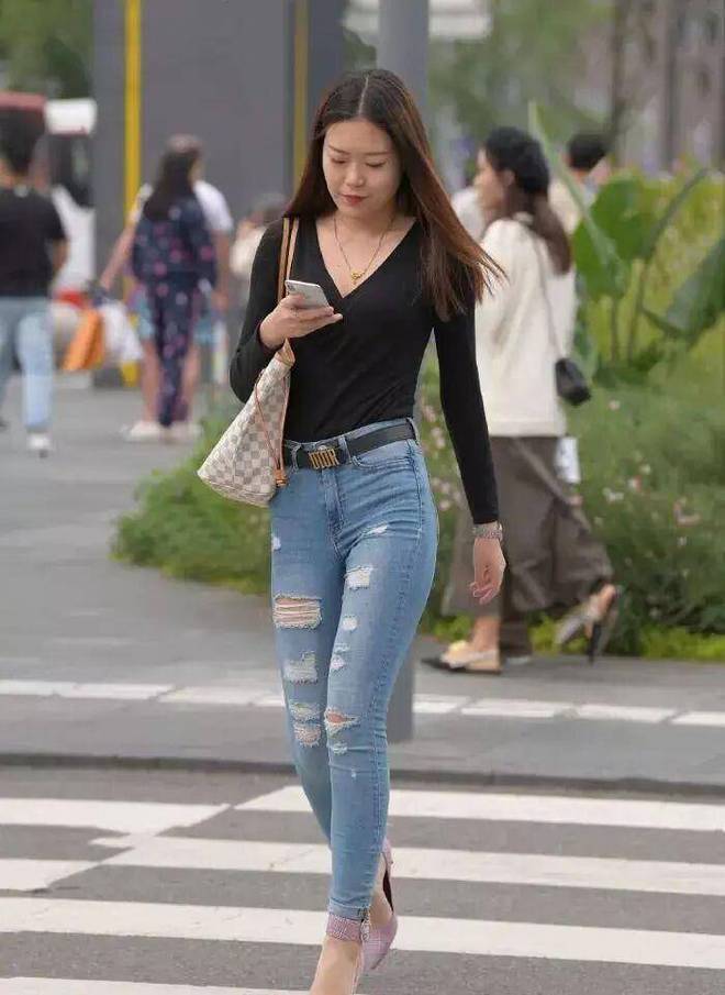 像这位美女的穿搭,就代表了如今街头的现状,不知你发现了吗?一条时髦修身的牛仔破洞裤,然后搭一件黑色的T恤,再来一双个性的尖头高跟鞋,这身穿搭不仅修身,而且还展现了时髦潮流的一面,对于女性来说,是不是很有吸引力呢?再说了,不管是破洞裤+T恤的组合,还是破洞裤+高跟鞋这对“CP”,都是大家比较欢迎的搭配。