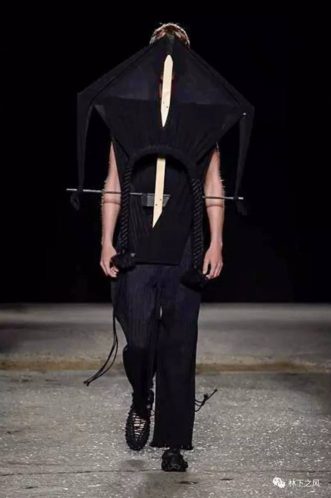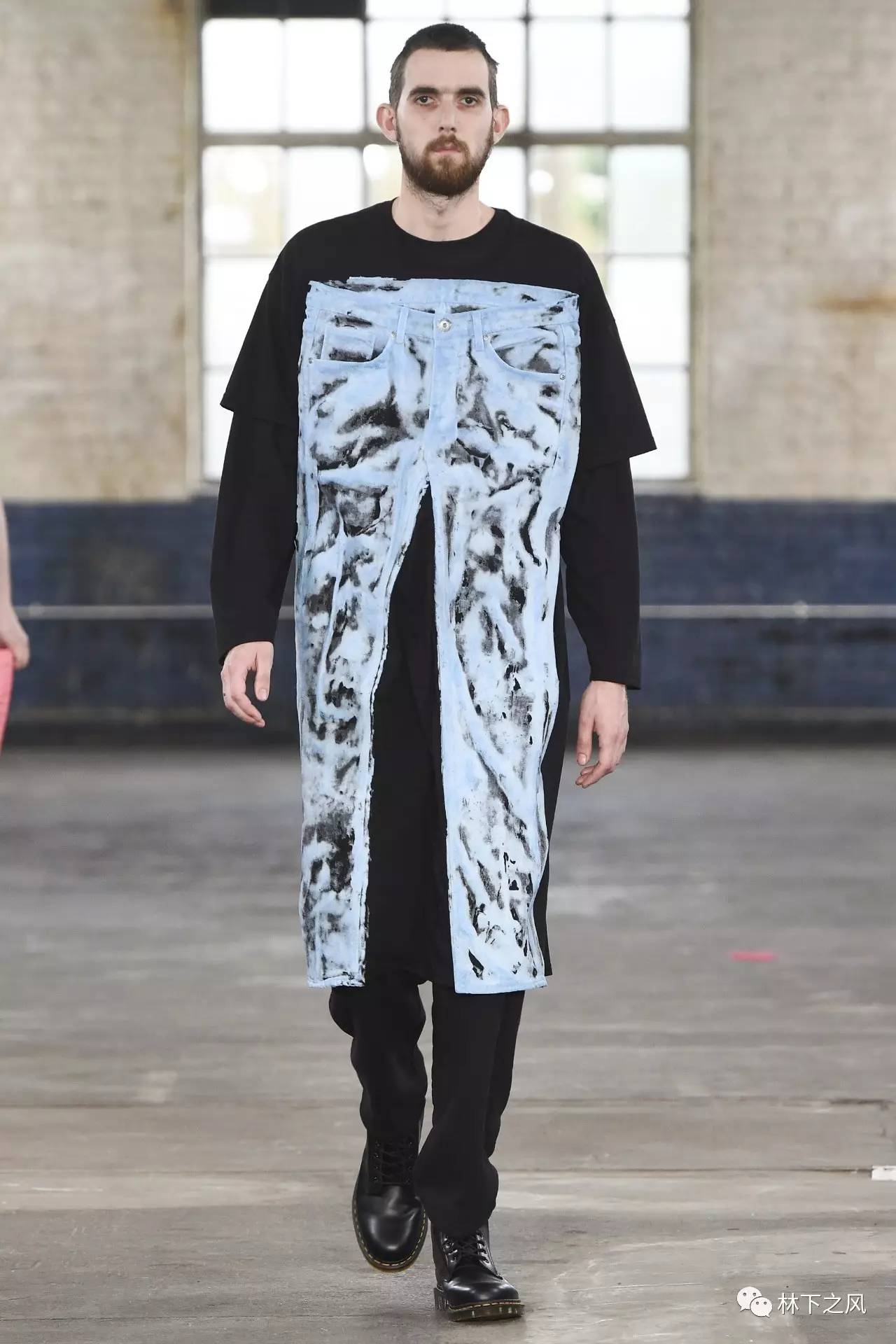 不过,如果要前卫到“上架展示”,那体现的可不仅仅是时尚理念,而是行为艺术的范畴。从这一点来说,颇受瞩目的男装设计师Craig Green(克雷格·格林)做了一次绝妙展现。真是的,又是圣马丁的研修生,这间学校对有个性的天赋者似乎特别爱惜纵容。