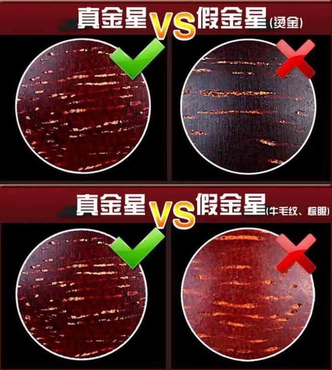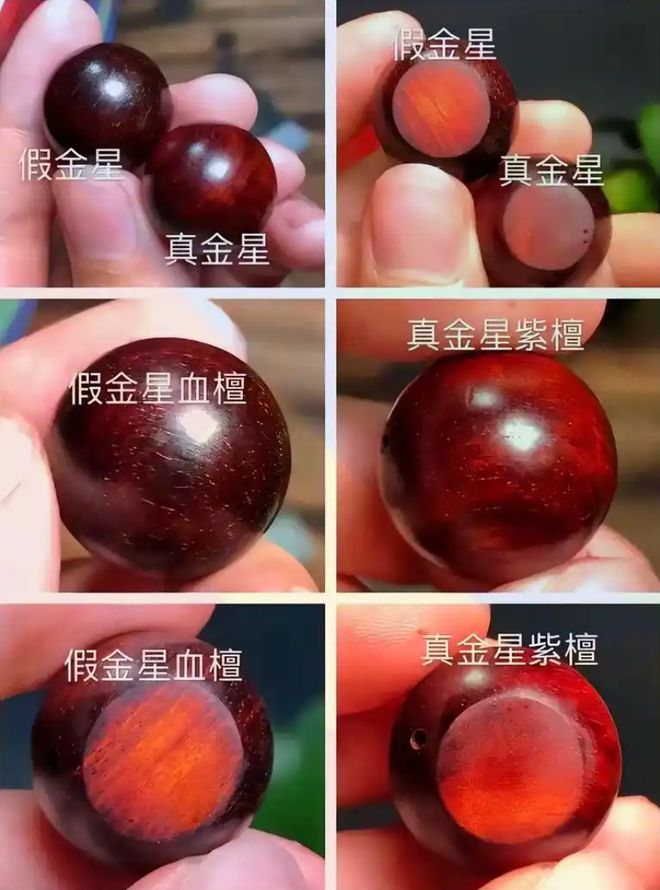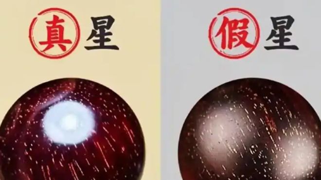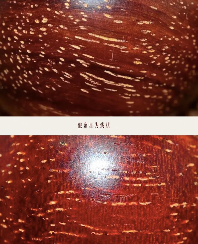 辨别方式是用放大镜观察木屑金星,可发现木屑填充在棕线内呈不规则状态,金星并非一个完整体,真的金星部分都融为一体,甚至有的可以看到珠子的车痕。假金星都是做好珠子再填充,不成整体,形态比较碎,所以不会有车痕留下。