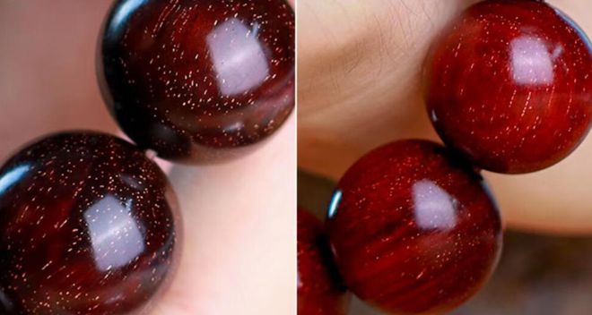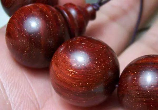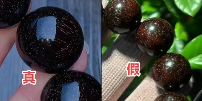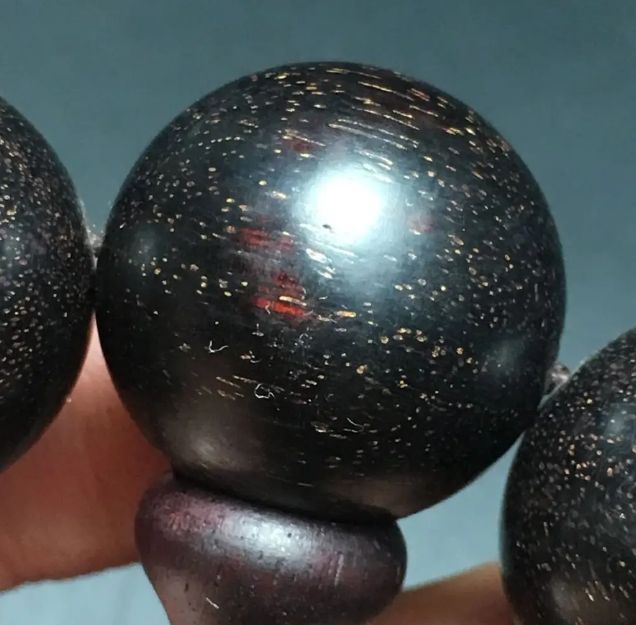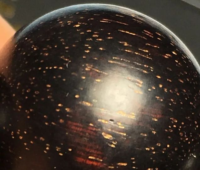 没见过真金星的人很难分辨,尤其是刚刚车出来的珠子,棕线被紫檀锯末填充后,跟真的金星混在一起,有的掩盖住了真的金星,有的点点锯末与真金星相互呼应,非常难以辨认。